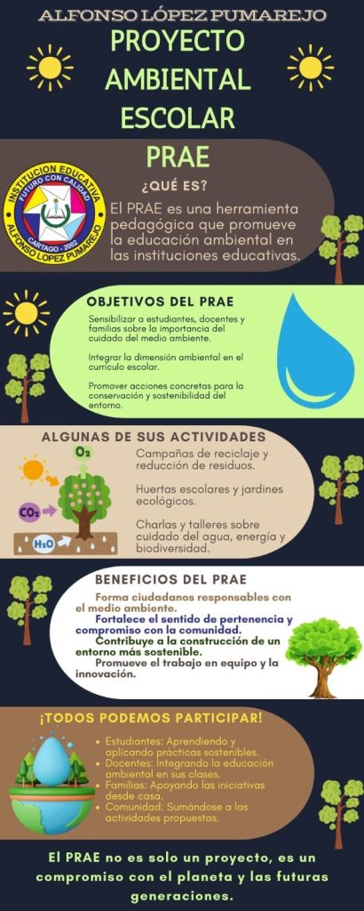 Los Proyectos Ambientales Escolares (PRAE) son estrategias pedagógicas implementadas en las instituciones educativas de Colombia con el objetivo de fomentar la educación ambiental y promover acciones sostenibles dentro de la comunidad escolar. Estos proyectos permiten a los estudiantes comprender los problemas ambientales de su entorno, desarrollar soluciones y generar una cultura de respeto y conservación del medio ambiente.